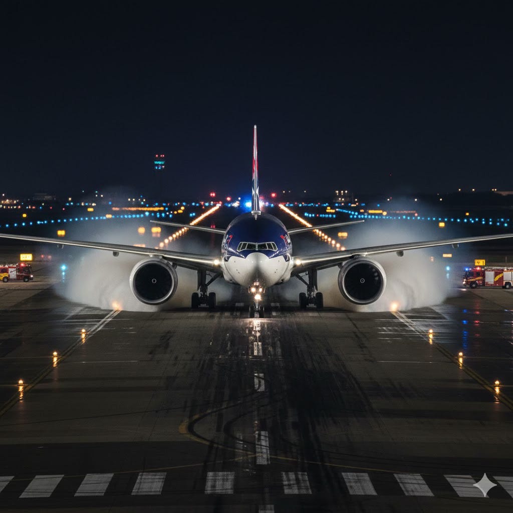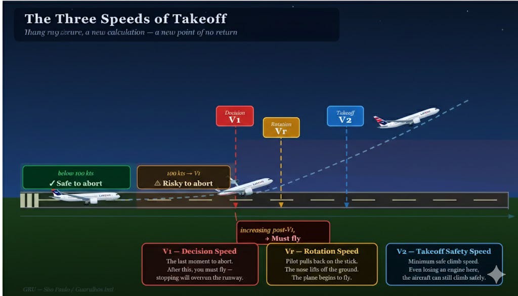 On Sunday evening at Guarulhos, the nose of the 777 was already beginning to rotate upward the nose gear visibly lifting off the runway when the crew apparently initiated the abort. At the speed required to begin rotation on a heavy widebody like the 777, V1 had already passed. The crew had entered the narrow window between Vr, the rotation speed, and V2, the minimum safe climb speed. In standard procedure, that window has only one exit: upward.