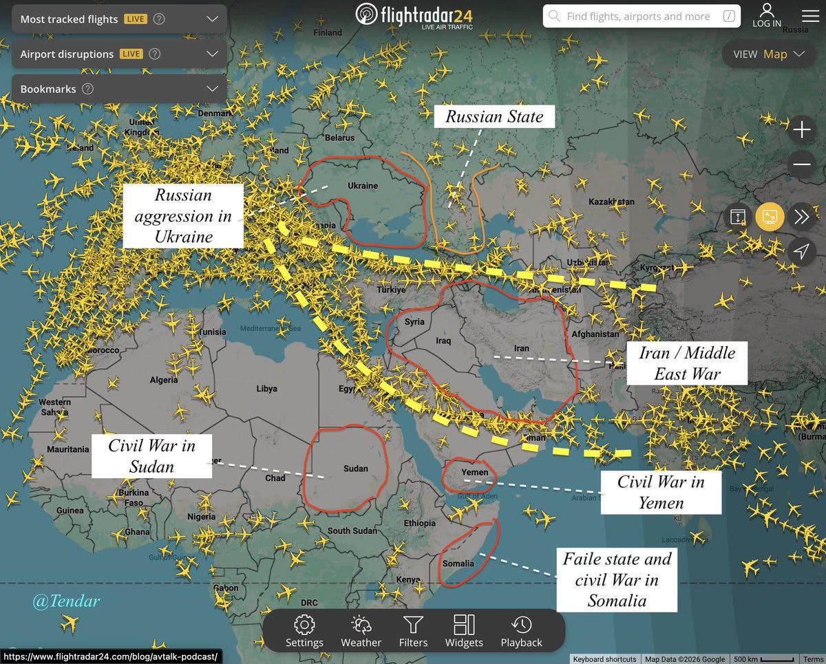 Maps from Flightradar24 tell the story more clearly than any briefing could. Air travel between Europe and Asia is increasingly becoming a challenge. Where the Gulf used to be a dense web of crisscrossing traffic — the busiest aviation crossroads on earth there is now a gaping void. The image above shows the conflict zones that have combined to create this crisis: the Iran/Middle East war at the center, Russian aggression in Ukraine to the north, the civil wars in Yemen and Sudan, and the failed state of Somalia to the south.