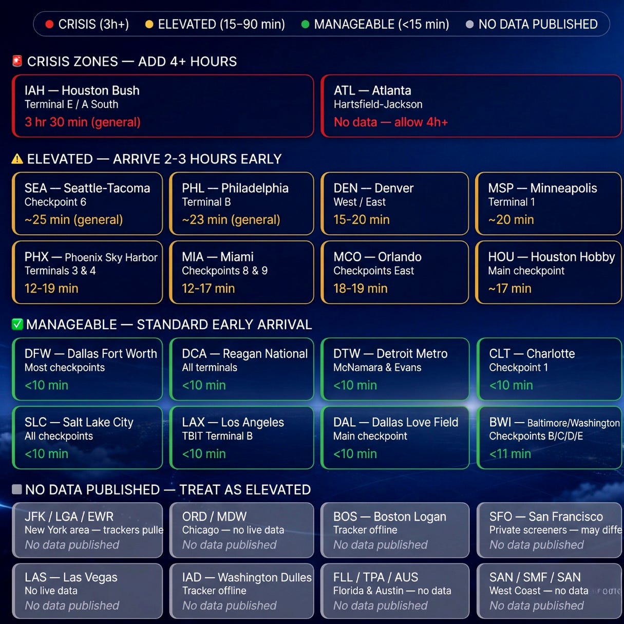 The airports still most at risk: ATL, IAH, JFK, LGA, EWR, ORD, BOS, LAS, IAD. Many stopped publishing live wait data — treat any “no data” airport as elevated until further notice.